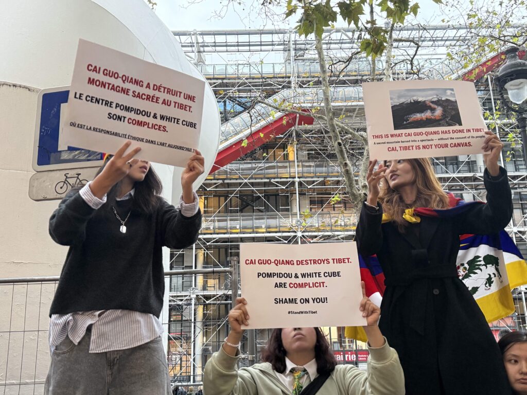 Students for a Free Tibet (SFT) France staged the protest as spectators gathered to watch Cai’s AI-assisted fireworks show, “Le Dernier Carnaval,” at the Centre Pompidou, denouncing the institution’s complicity in China’s ecological and colonial vandalism in occupied Tibet.