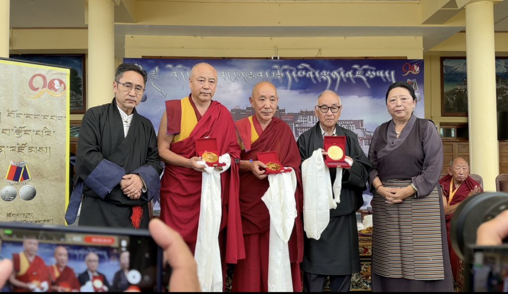 During a ceremony held today at the Tsuklakhang, the main temple in McLeod Ganj, three representatives from the Gaden Phodrang Institution—Desang Tsering, Secretary of the Gaden Phodrang Institution; Monk Godruk, a senior administrator from the Dalai Lama’s Office; and Benza Thupten, a personal attendant to the Tibetan spiritual leader and former political prisoner—were awarded recognition medals for their lifelong service and contributions to the Tibetan spiritual leader.